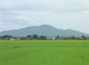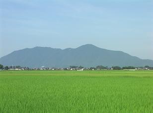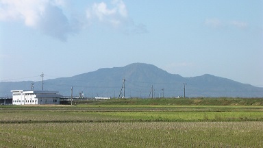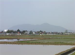 写真の中心からやや右側に、雲に覆われて小さくふもとだけが見えるのが多宝山・弥彦山です。