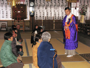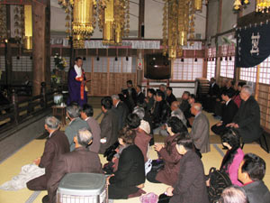 御住職と共に合掌 山首法話を聞き入る皆様 来年完成の会館をご期待下さい…。