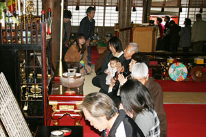 多くの参拝者の中、お祖師様の綿が外されました。 これより秋のお彼岸まで、日蓮聖人様はいつものお姿です。