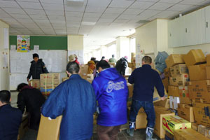 カップラーメンから衣類やオムツ粉ミルクに至るすべての生活必需品を段ボール120箱の積荷を下ろす。