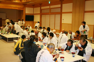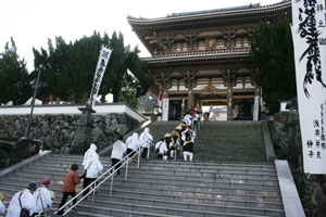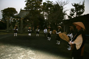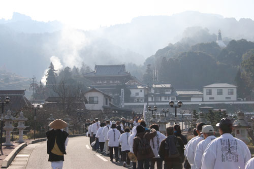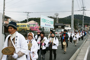 - 仏教の経典に基づく過酷な修行。そこに世の中の不条理を見つけ、苦しみからの離脱法を人々に説き続けた開祖等。その功労を私達は忘れてはなりません。そう思いながら寒修行と称し、今年も歩いています。唱える経文が目に見える白い吐息を頼りに歩いております。指先のしびれの先にあるちっぽけかもしれない幸せを信じ、私達は太鼓を叩いています。頂いた浄財を社会の為にと生活苦の家庭に届け続けて六七年。身勝手かもしれませんが、己を酷使して頂く尊い皆様の心こそが、社会不安を除去する手立てと考え、続けています。