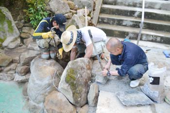 しかし…、なかなか思う位置に大石が座りません。 自分たちでワイヤーを修理。無事に作業が進み出した瞬間。やったー!