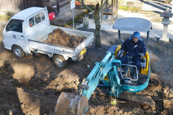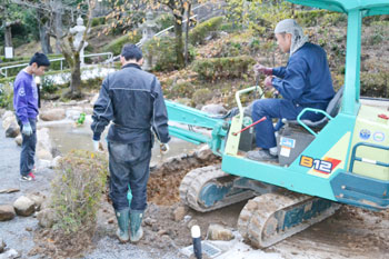 今の池をキープしながらの慎重な作業。勿論、お寺の者だけで進めていく工事です。