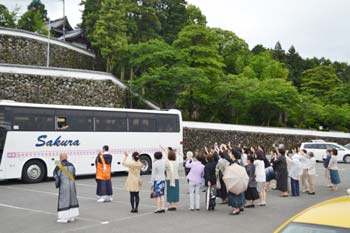 今年は梅雨入りが早く、心配でしたがお陰様で天気に恵まれ、山門を潜る参加者の方々。 牧瀬会長と渡辺支部長と談笑される御前様。
