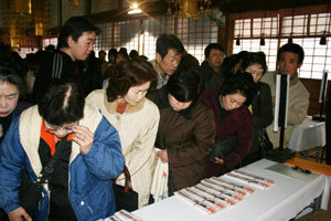 新しく建設設置された受付で参詣者は思い思いに求めていました。