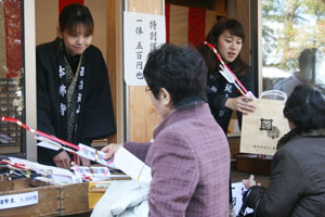 午前10時を過ぎると受付が混み合います。参詣者の方々は、相談しながら願目を決めておられました。午前11時、読経が始まりました。