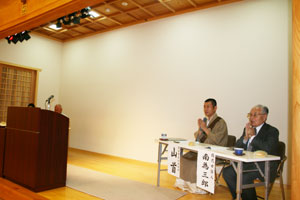 猛暑が続いた今夏、役員の皆様におかれましては体のみならず、気候に順応出来ない農作物や、伴う不景気にさぞご苦労の事と推察しております。信仰を糧に何卒乗り越えて頂きたいと拝む事しかできない住職であります。 さて、この度は総会のご案内を致しましたところ、繁忙の中ご参集賜り、篤く御礼申し上げます。当山は、ご覧の通り皆様のお陰を持ちまして、今年度も護持に従事しつつ繁栄をしております。これより、議題にそってその経過をご説明させて頂きますが、今年は境内の充実を中心に進めました。沿革書き換え・各御堂の案内・御堂を繋ぐ参道・サイン版設置などです。励光閣が完成し、社会的にも更に周知された本佛寺。現在参詣者だけでなく、観光に訪れる方や、講演を聴きに来られる一般来訪者が多く見られるようになりました。そのため境内散策者が増え、事務所に境内の地図を求め、順路などを尋ねる訪問者が後を絶たなくなりました。そこで、看板の設置が必須となり、各所に案内版を立てた次第です。最近は檀信徒も読まれるなどの相乗効果が見られ、当山の教義的位置付け、当地への建立、御堂造立の裏付け等を理解され、私共の目指す「誇れる本佛寺」「力強い本佛寺」が内面から浸透しているような感触を得ている所です。なお一層の啓発に励む次第です。 また、仁王門の塗り替え、参道整備もその現況を鑑みて行いました。現在は、「常仕殿」解体後に建立している「暁六庵」を今月五日に上棟式を予定し、着々と建築を進めています。これに関しては、師父(銅像主管)が、個人の年金で造りたいとの希求により、境内ではありますが勝手乍らそれに答え、改築の着工に至ったものです。建物名称は、両親の名前から付しました。事後報告をお許し下さい。 ところで、「励光閣」落慶に関する日程ですが、議題にありますので、その折り詳細を諮り決定したいと願うところです。これは予算との絡みは必然ですので、慎重にご審議を賜りたく存じます。繰り返しますが、決して当山は、須く後退しておりません。勢いも止まってはおりません。むしろ恐ろしい程進歩していると申し上げても誰もが疑いのないところでありましょう。されど、ここでしっかり地盤を固めるつもりで、一丸となる大会を開催出来るよう、共に智慧を絞りたいのです。各位のお知恵を拝借させて頂きたく望みます。 次に「御会式」については、例年通り盛大に奉行し「報恩」を示します。日蓮宗の行事ではありますが、うきは市のお祭りとなった御会式を最も喜んでおられるのは日蓮聖人でありましょう。昨年は朝倉題目講が復帰し更に賑やかになりました。グローバル化が進み、日本が日本らしさから遠ざかるような現代社会現象。私達は時の流れを顧みず、この行列を続けます。議題のところで、これに関してもご説明をさせて頂きます。 本日はこの二点を重点的に、十年後百年後の宗教を考えながら、未来も癒しと輝きを続ける本佛寺を目指すため、この役員総会を開会致します。最後までお付き合いの程、宜しくお願い申し上げ、趣旨説明並びご挨拶と致します。 合掌 平成二十二年十月一日 山首 佐野前延