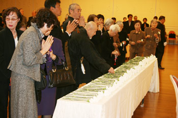 沢山のお花が手向けられ、合掌しお題目を唱える参加者の方々。