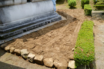 まず御前様が測量をし、石積みをして外構を整備しました。バラスを敷き雨水への対応が完了。