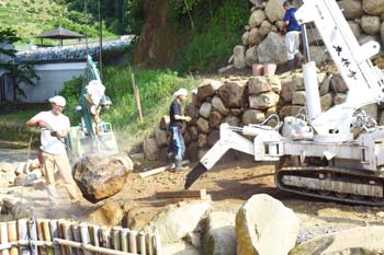上段をついて、次の石垣へと移りました。 植樹と同様、カニクレーンが大活躍でした。