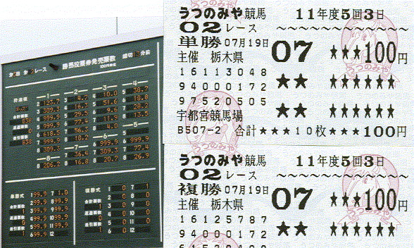 下(↓)が、馬券とオッズボード注目は、右の馬券を買った直後のオッズ(左下) なのだが、単勝式、複勝式ともに、私の買ったのしか売れていない・・・ さすが、地方競馬・・(この時、〆切り13分前)