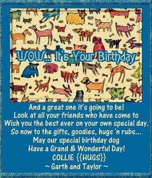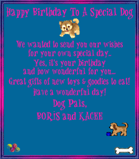![]() Happy 2nd Birthday Noiraud!!! Oh Noiraud, you handsome young Labby ... our wishes for you are ... 1. May you have the VERY happiest birthday ever! 2. May you enjoy the love given to you from your "Mom & Dad" 3. May you receive many Birthday greetings and gifts from your friends around the world 4. May you have MANY more happy birthdays and a long, joyous and healthy life We'll be thinking of you today and celebrating with you from afar. Love from your friends in Canada, Arlene & Marshal Dillon |