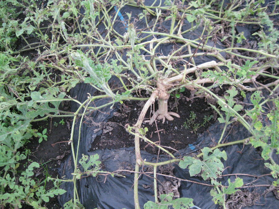 | 2025年9月14日 スイカの茎 5月は、ツルの細さでしたが、9月の現在は、たくましい! まだ実を付けていますが、これにて終了です。 |