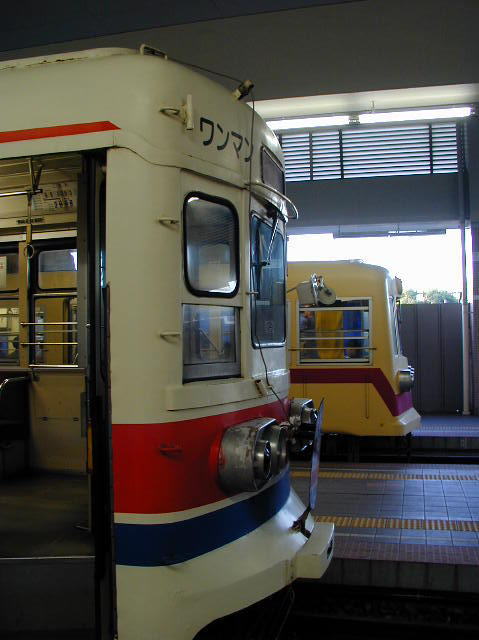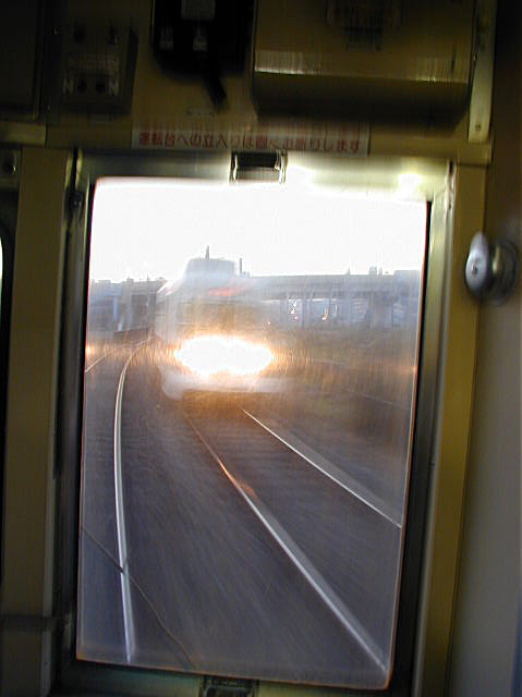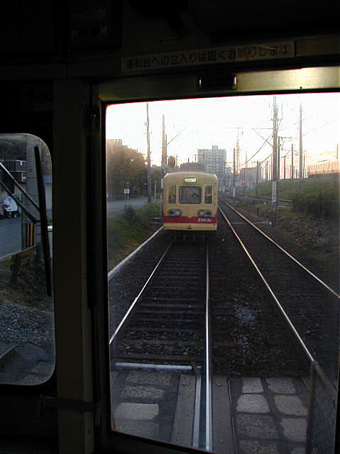 折尾東口駅手前での離合シーンです。夕闇も迫り前照灯も点灯!!
