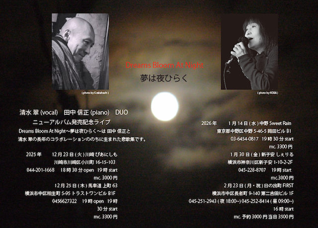 ようやく完成を迎えることができました。 今までのアルバムが全部三年越えでしたので今回は早めに仕上げよう・・・と思っておりましたのに 結局2023年1月からですので、やっぱり2年と350日くらいかかっちゃいました。 1日1日、道は遠かったです。 ひょっとしたらもうできないんじゃないのかなあと思った時期もありました。 きつかったですね。 挙句にセルフライナーノーツにまで手を出しちゃったしね。 (12ページのブックレットになりました。清水、渾身の作、ぜひ読んでいただきたい・・・) 12月の半ば頃には四角いCDになって手元に来るはずです。 今回は、ディストリビューションを disk union にお願いいたしました。 全国発売はたぶん1月14日。 その前にレコ発ライブに持っていきますので一刻も早くお手になさりたい方はぜひ、 ライブ会場にお越しくださいませね。 清水もお会いできる、そっちの方がめちゃうれしいですので。 ミックス、マスタリングは前回の馬場くんとのアルバム、『Blue Rose .』でもお願いした、前田 励さん。 そして、今回は写真、デザイン、構成などを写真家、小林 潔さんにやっていただきました。 ジャケットデザイン、自分でやるの?どうする?どうしよう? と、途方に暮れてた時に、スーパーマンのように現れてくれた小林さんです。 このおふたり、そして関わってくださった全ての方々の力がなければ、きっと完成することはなかったと思います。 ほんとに言葉では言えない・・・と言いつつ言っちゃうけど ありがとうございました! 感謝の念に堪えません。 みなさんのおかげで、いいアルバムになりました。 自分でも今までで一番かなと思っています。v たくさんの方々に聴いていただけたら最高に幸せです。 (清水のFacebook の記事より) 2025年12月〜2026年1月のスケジュール ____________________ 12月2日(火) 関内 AB-SMILE 矢藤 健一郎トリオ 矢藤 健一郎 (drums) 丹羽 悦子(guitar) 塩見 暁俊(bass) 清水 翠(vocal) ![]() ____________________ 12月7日(日) 野毛 Sam's Bar ブルースのギグ。 京浜パラダイス (濱乃みしぇるvo(こと、加藤美幸)/ キング清六ts / フリル 江藤 bs / カルロス中澤gt / ゴーリ吉岡dr) Jade Clearwater Survival (清水翠vo,hp / ダァイ大橋gt / 長沼孝宗bs/ 加藤達也dr) ![]() ____________________ 12月21日(日) 日の出町 FIRST 〜静かな夜に飾りのないストレートブルースを〜 SILVER BLUE 田村 博(piano) 下梶谷 雅人(guitar) 久末 隆二(bass) 清水 翠(vocal, blues harp) 17時30分 open 18時 start mc. 3500 円 *お問い合わせ JAZZ FIRST https://jazz-first.com/ ![]() ____________________ *印は、信正さんとのニューアルバム発売ライブです。 *12月23日(火) 川崎 ぴあにしも 川崎市川崎区小川町16-15-103 044(201)1668 18時30分 open 19時 start mc. 3000円 田中 信正(piano) 清水 翠(vocal) ____________________ *12月25日(木) 馬車道 上町63 横浜市中区相生町5-95 トラストワンビルB1F 045(662)7322 19時 open 19時30分 start mc. 3300円 田中 信正(piano) 清水 翠(vocal) 2026年 ____________________ *1月14日(水) 中野Sweet Rain 東京都中野区中野5-46-5 岡田ビル B1 19時30分 start mc. 3300円 田中 信正(piano) 清水 翠(vocal) ____________________ 1月17日(土)馬車道 上町63 横浜市中区相生町5-95 トラストワンビルB1F 045(662)7322 14時30分 open 15時00分 start mc. 3300円 馬場 孝喜(guitar) 清水 翠(vocal) ____________________ 1月19日(月) 川崎 ぴあにしも 川崎市川崎区小川町16-15-103 044(201)1668 18時30分 open 19時 start mc. 3000円 星野 まさきトリオ 星野 まさき(piano) 石井 康二(bass) 矢藤 健一郎(drums) 清水 翠(vocal) ____________________ *1月30日(金)新子安 しぇりる 横浜市神奈川区新子安1-10-2 2F 19時 start mc.3000円 田中 信正(piano) 清水 翠(vocal) ____________________ *2月23日(月・祝)日の出町 FIRST 横浜市中区長者町 9-140 第二吉田ビル 1F 15時30分 open 16時 start [ご予約 / お問い合わせ] 045-251-2943 (夜18:00〜) 045-252-8414 (昼09:00〜) mc. 予約 3000円 当日3500 円