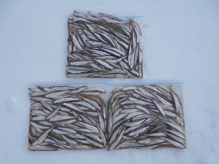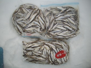 2014/1/20 今日も極秘ポイントへ。朝は魚影もまばらで棚もバラバラ。仕掛け2連結の12本針左右で開始。一番上に掛かったり一番下に掛かったりもう大変。それでも渋くて今日は撃沈かなと思っているうち、9時頃から好釣になってきた。11時カウントで348匹。昼食タイムをとって、仕掛けをひとつにして再開。仕掛けひとつだと楽ですね。その後も好釣で、3時カウントで848匹。天気がいいので1時間残業。残業時間は少し渋くなったが922匹で終漁。天気、釣果ともに最高でした。そろそろモービル運ばねば。 |