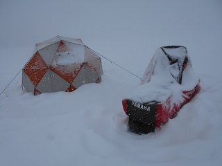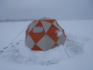 2017/2/6 壊れた部品も入って、テントも直ったので、モービルを運びながら、森のうたさんに行ってきました。今日も悪天候、吹雪です。深場に行って、穴3個開けたが魚がいない。風も強いのでそのうち群れも入るだろうと、テントを立てて開始。それが間違いの元。全然、魚が入ってこない。11時で25匹。その後も釣れないし、風も強いので、1時でギブアップ。52匹でした。大撃沈。テントをたたんでから、少し穴探しをしたが、いい穴見つかりませんでした。次回、どうすっぺ。 |