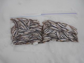 3/8 今日は森のうたさんです。浅場に入りました。氷の厚さが1.3メートルもあるので、穴探しなしで即決、3個あけるだけでも大変。激渋です。頑張っても釣れないので2時終了で108匹、最後にきて絶不調。氷が厚くなると釣れなくなりますね。 |