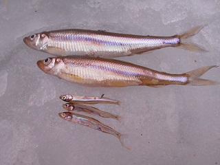 1/26 西エリアの氷がまだなので、極秘ポイントへ行ってきました。テントを張ってから魚探を入れたら、アレレ、魚がいない。まあいいかと開始。群れも入ってこなくて釣れない。そうこうしているうち、小さい群れが入ってくるようになりポツリポツリ釣れる。11時カウントで220匹。その後も小さい群れしか入らず、3時終了で416匹でした。 1/23 極秘ポイントへ行ってきました。朝のうちは食いが悪く、今日も撃沈かなと思っているうち、だんだん食いが良くなり好釣になってきました。11時カウントで330匹。その後も好釣だが、1時ぐらいからまた食いが悪くなり、3時カウントで717匹でした。朝晩食いが悪く、日中食いがいいという感じ。なんでかな。 |