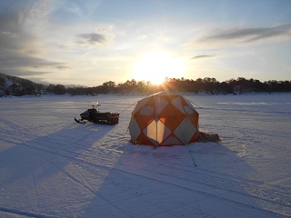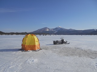 2/10 今日も森のうたさんです。中深場に入りました。渋いです。型も小さい。見えない当たりを取って、頑張って600匹でした。今日は風もなく穏やかな小雪でした。私の30年物のモービルでも問題なく走れました。3連休は混み合いそうですね。 |
