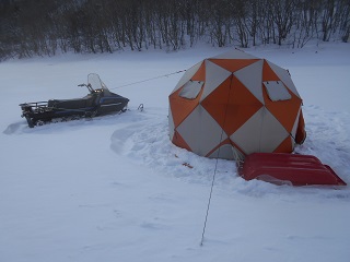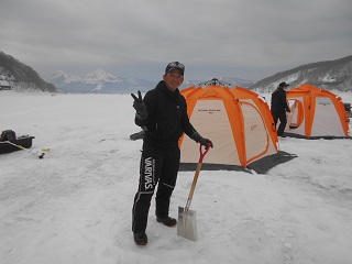 1/29 大寒波も収まったようなので、モービルを運んで森のうたさんに行ってきました。大雪になったら激渋になったとのこと。いつもの深場で穴を開けたが、魚がいない。でもテントを張って開始。群れもまばらな上に、棚がバラバラ、食いも渋くて釣れない。11時で83匹。今日は撃沈だなあと思っていたら、お昼ぐらいから群れが入り出し、ポツポツ釣れる。が、ここでトラブル。PEのつなぎ目が切れて、釣れた魚と仕掛けごと落下。予備の竿を出して再開。その後もポツポツ釣れて、3時で315匹でした。今日は穏やかな天気でした。魚も大きいです。 |