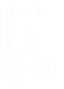 揺れるとLEDが点滅するイヤリングです。 構造は簡単ですが、デザインがいまいちでした。 この作品は、今では原形をとどめていません。代わりに図解を載せました。 電池は電気ウキとかに使用される筒型のリチウム電池です。 電池で全体の大きさが決まってしまいます。 イヤリングはちょっと無理がありますね。ハハハ 大きさ 48mm X 28mm