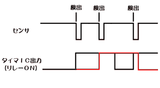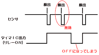 タイマーICの出力がいったんHighになると、その間に入力された検出信号は無効になってしまい、次に有効になるのは、出力がLoにもどった後である。(下図)
