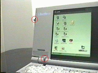 ところで、モバイルコンピューティングといえば、 PDAから延びたケーブルにPHSが接続されているわけですが、 このPHSがなにか納まりが悪くてしょうがない感じです。 ところがこの312Sに関して言うと、 大きさがちょうどLibrettoのディスプレイ左側のスペースに ぴったりフィットなのです!。偶然にしては、できすぎ・・・ さらに、Libretto側の2つの突起がちょうどよく PHSを支えてくれます。 ただこれだけでは、何も固定されていないので、 何か固定用の止め具が欲しいところです。 (そのうち作りたいと思います。) |