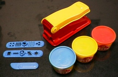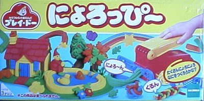 ねんどは「プレイ・ドー」という名称で、昔からあるらしい。 それにしてもこのねんど、とてもおいしそうなニオイがする。 それもそのはず、原料は、小麦粉、水、食塩、オイル、食用色素、 バニラエッセンス等。 これに、砂糖と卵を入れたらホットケーキが焼けてしまいそうだ。 小さい子供が口に入れてしまっても安心というわけであるが、 食欲をそそるニオイというのはどうなのだろう。 |