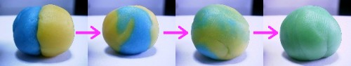 | また、色は混ぜて作ることになっている。次の例は、青と黄で緑を作ったものである。 |