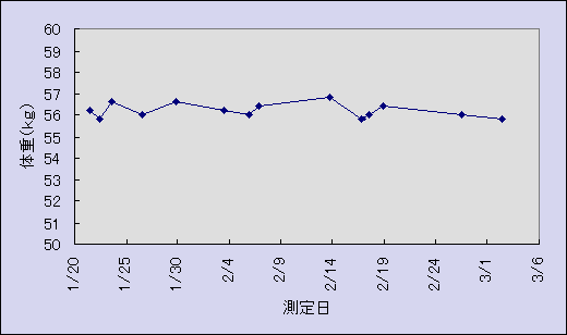 ヘルスメータ本体からのデータを読み取り、日付とともにファイルに保存することができます。 ファイル形式はテキスト形式なので、表計算ソフトを使って、統計処理やグラフ表示が簡単にできます。 ファイルの内容は、次のようなカタチで保存されます。 98/01/21 12:22:43, 56.2 98/01/22 12:14:45, 55.8 98/01/23 16:12:56, 56.6 98/01/26 14:01:42, 56.0 98/01/29 20:55:04, 56.6 98/02/03 11:31:28, 56.2 98/02/05 22:05:49, 56.0 98/02/06 21:19:28, 56.4 98/02/13 18:47:42, 56.8 98/02/16 21:05:23, 55.8 98/02/17 12:33:15, 56.0 98/02/18 22:02:25, 56.4 98/02/26 12:27:01, 56.0 98/03/02 12:19:13, 55.8 このデータを表計算ソフト(Microsoft Excel)で読み込んで、グラフ表示してみます。 |