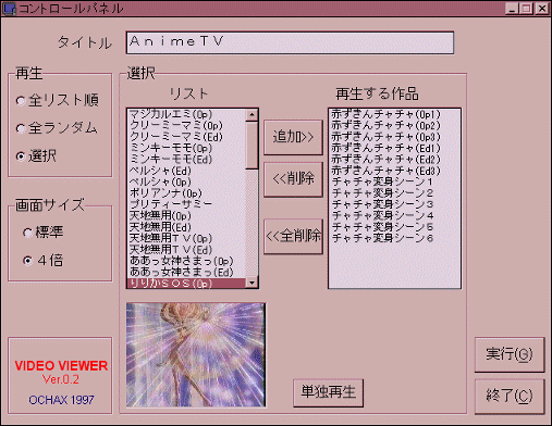 アニメのオープニングとエンディング、メインシーンをAVIファイルにしました。 もともと、複数のMOにテーマ別に分けていたものをCD−R1枚に収めました。 収録タイトルは次の通り。だいぶ偏りがあります。(^^; |