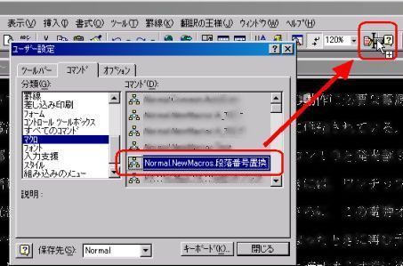 「コマンド」タブを選択し 「マクロ」→「段落番号置換」を選びます。 |