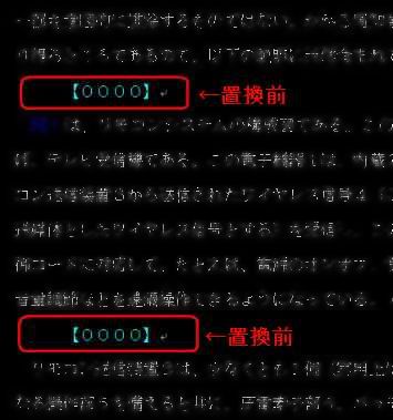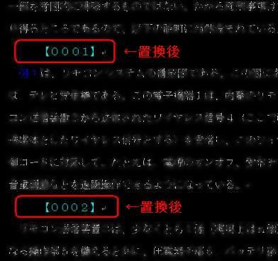 段落番号置換を実行してみます。 明細書中の段落番号を入れたい場所に 【####】の文字列を入れます。 ####は任意の4桁の数値(半角または全角)です。 この例では【0000】を入れました。 |