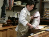 夜の仕込みのための大きなタラの解体ショーが見られました。