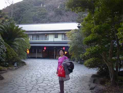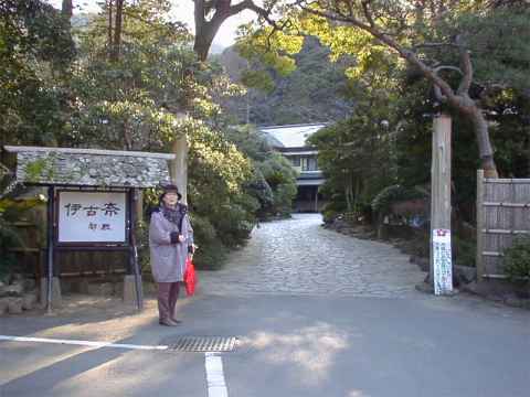 「伊古奈」はなかなか に立派な門構えをした旅館で老舗という風格を持っていた。 玄関の両脇に篝火を焚いてお客を迎えるという、 昔の陣屋風の雰囲気を醸し出していてなかなかに好感が持てた。玄関を入ってフロントの人に「内湯巡りを お願いします。」というと、「内湯にしますか、露天風呂にしますか。」と言う。「露天風呂をお願いし ます。」と言うと、露天風呂への道順を教えてくれた。