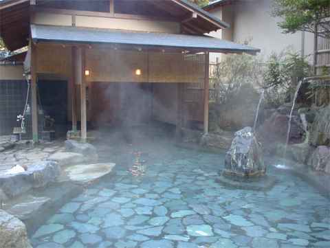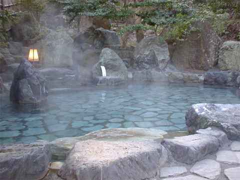 男性用の露天風呂は旅館の中から出て少し登った山側の 斜面に造られていた。「山の露天風呂、銀河の湯」と名付けられたこの露天風呂は、建物全体的には和風を イメージした造りになっていて、脱衣場などは結構広いのだが内湯はなくて露天風呂だけが造られていた。 露天風呂は岩造りのもので、かなり大きな太い茄子状の形をした湯船になっていて、左の方の岩が積み重ね られた上の方から湯が滝状に流れ落ちていた。そのほかに筒状に造られた打たせ湯が二つほどあり、そこに 熱湯注意という張り紙みたいなものがしてある所を見るというの温度はかなり高いのであろう。建物の裏の 方に造られていいるので山や林位しか見ることができないのが残念だが、露天風呂の上の屋根がないので星 がよく見えることから「銀河の湯」と名付けられたのではないかと思えるほど解放感十分であり、辺りの 景色をゆっくりと眺めることができる。
