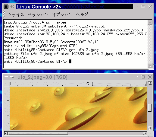 そこでとりあえずSambaを組み込んだLinux側でsmbclientコマンド(ftpに似た感じのもの)を使用すればなんとかMacOS側のリソースをアクセスできるようになります。