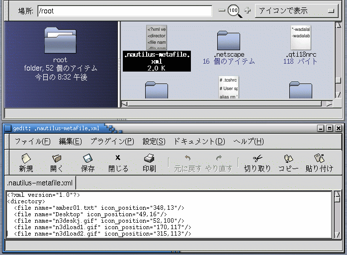 Nautilusにおける様々な状態(ファイル別アイコン位置情報やエンブレム情報など)は「.nautilus-metafile.xml」という名前のXML形式ファイルに格納されます。