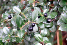 イヌツゲは大阪付近の山にごくふつうに生えている雌雄異株の常緑性の低木で、アカマツなどが生える二次林の代表種の一つです。大きいものですと幹の直径が 20 cm、高さ10 m 程度に達するものがありますが、ふつうはもっと小さなものが目につきます。これは、大阪近辺の山では比較的短い周期で山の木が切り倒され、切り株から新しく芽を吹いて森林が再生していくという二次林特有の歴史が関係しているのかもしれません(右写真:イヌツゲの果実(池田市五月山 2011.12.3))。