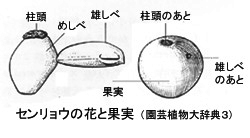 多少名前が似ていて、やはりお正月には欠かせないマンリョウ(ヤブコウジ科ヤブコウジ属)とは、分類的には無縁で、センリョウの方はかなり原始的な性質を残した植物とされています。それは茎の中の水を通す組織がふつうの被子植物のような導管ではなく、裸子植物と同じ仮導管でできているからです。また、花は黄緑色で、6-7月頃に咲きますが、花弁や萼はなく、球形の雌しべ(子房)に1本の雄しべがくっついているという変わった形をしています(下の図は、園芸植物大事典から引用しました)。赤く熟した果実をよく見るとその先端に小さな黒い点があり、さらに少し離れてもっと小さな(ルーペで見ないと分からないぐらい)点があります。果実の頂上の点は雌しべの柱頭(花粉をうける場所)のなごりで、もう一つの点は雄しべがくっついていたなごりです。