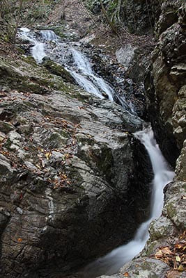 上段は斜瀑で下段が岩の隙間に落ちる直瀑で近寄ることができない。