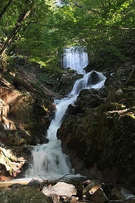 落差10mほどを豊かな水が勢いよく流れる素晴らしい滝である。