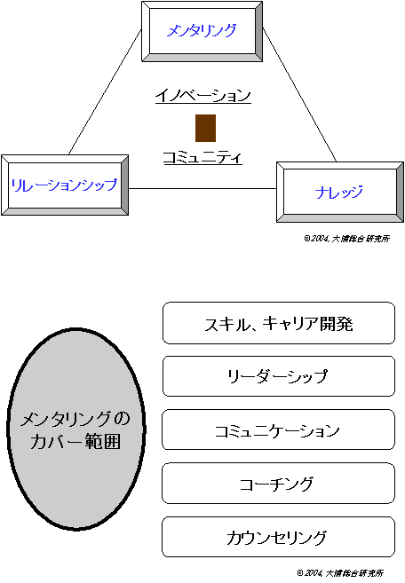 目 的 知識資本主義の世界では 従来のOJTだけで大きな成果をあげることは難しい。 また、イノベーション実現にはコミュニティが欠かせない。 そして、コミュニティでは、メンタリング、リレーションシップ、ナレッジの マネジメントが必須の要件になる。 組織における メンタリング+リレーションシップ(関係性)+ナレッジの 統合マネジメントをファシリテーションする。