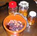 そのまま干さずに置いてあります。瓶の中は美味しそうに色よく出来ています。 塩加減は本のとおりにやったのですが少し塩が強かったです。 昨年漬けた「らっきょ」もまだ大分残っています。 「らっきょ」も「梅干」も当分持ちそうです。 |