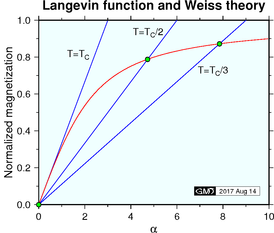 At the Curie temperature \(T_C\), tangents of the two curves (2) and (4) are equal. Approximating \(L(\alpha) \sim \alpha/3\) for small \(\alpha\) and equating the gradients of (2) and (4) at \(\alpha=0\), the next relation is obtained, \[ \frac{N m}{3} = \frac{k T_C}{\mu_0 m w}. \quad (\alpha \ll 1) \] From this relation, the constant \(w\) is obtained as, \begin{equation} w = \frac{3 k T_C}{\mu_0 N m^2}. \label{eq05} \end{equation} Substituting (5) to (4), \begin{equation} M = \frac{N m}{3} \frac{T}{T_C} \alpha. \label{eq06} \end{equation} Introducing normalized variables \(M^*=M/Nm\) and \(T^*=T/T_C\), (2) and (6) are given as, \begin{eqnarray} M^* & = & L(\alpha) \label{eq07} \\ M^* & = & \frac{T^*}{3} \alpha \label{eq08} \end{eqnarray} Although analytical solution for these equations is unavailable, it is easy to solve numerically by using standard root finding routines (ex., Press et al. 1992). Figure below shows the solution of the \(M^*\)-\(T^*\) curve (red line). Measured data of Ni (blue line) for the temperature range higher than the room temperature is also shown.