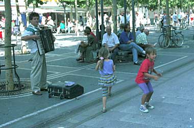 街中の広場では大道芸人が集まってパフォーマンスを繰り広げています。