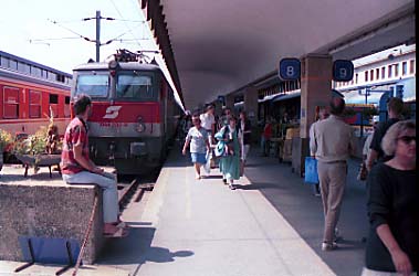 | 翌日は列車でウィーンへ移動です。ヨーロッパの列車はどれも快適であっという間に着いて(寝て?)しまいます。 ウィーン駅についてからは、環状バスに乗って市街地へ。取り敢えずツーリストインフォメーションへ行く前にガイドブックに載っているホテルへ部屋が空いているか電話を入れてみましたが、予算にあいそうなホテルはどこも満室でした。ツーリストインフォメーションへ行ってみたら、そこのオネーチャンの愛想の悪いこと。 予算を告げると「いい場所のところはないよ。だいぶ市街地から離れるよ。」とぶっきらぼうに言われました。紹介してもらったホテルは市街地からはやや離れていますが、中心部まで地下鉄1本で行けるので、別に不自由は感じなさそう。行ってみて部屋も清潔だったので結局そこに決めました。 |