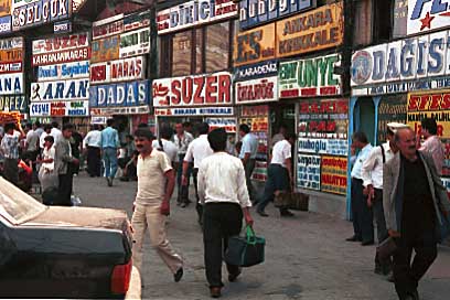 | 翌日の夕方、イスタンブールのオトガル(バスターミナル)へ向かいます。トルコでは長距離の移動はバスが主流で、大小たくさんのバス会社が各地に路線をもっています。オトガルではバス会社の客引きなんかもいて、活気にあふれています。長距離の移動の場合、夜行バスで移動することになるので、お金のない旅行者にとっては、宿代がういてしかも時間も有効に使えてと一石二鳥です。途中2時間に一回くらいの割合で、ドライブインにとまります。バスに乗ると車掌さんが香水みたいなものを乗客の手にふっていきます。現地の人達がそれを頭や手にのばしてつけているので、私もマネをしてやってみました。なんか表現しにくい香りでしたね。 |
