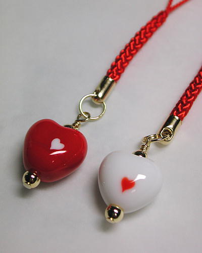 最近作ったとんぼ玉をストラップに仕上げています。上の写真はハート玉を根付につけたもの。今じゃ根付をストラップ代わりに使う人がほとんどでしょうから、ハート玉のストラップとしてもいいでしょう。作ったストラップの中で一番いいできだと思います。赤白両方そろっているところがまたいいですねぇ。これなら売れるかも?